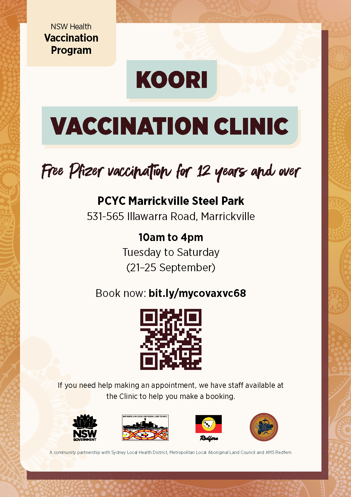 Free Pfizer Vaccination clinic at Marrickville PCYC from Tuesday to Saturday (21-25 September), 10am-4pm.· Aboriginal