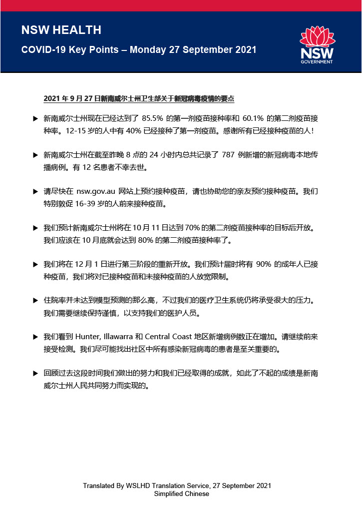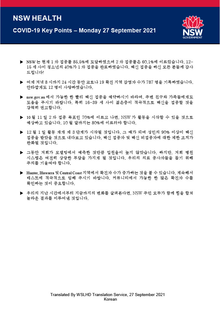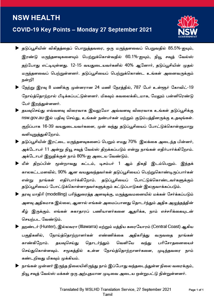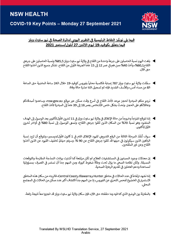 Please see below the NSW Health COVID-19 Key Points in Arabic, Sudanese Arabic, Chinese, Korean and Tamil.