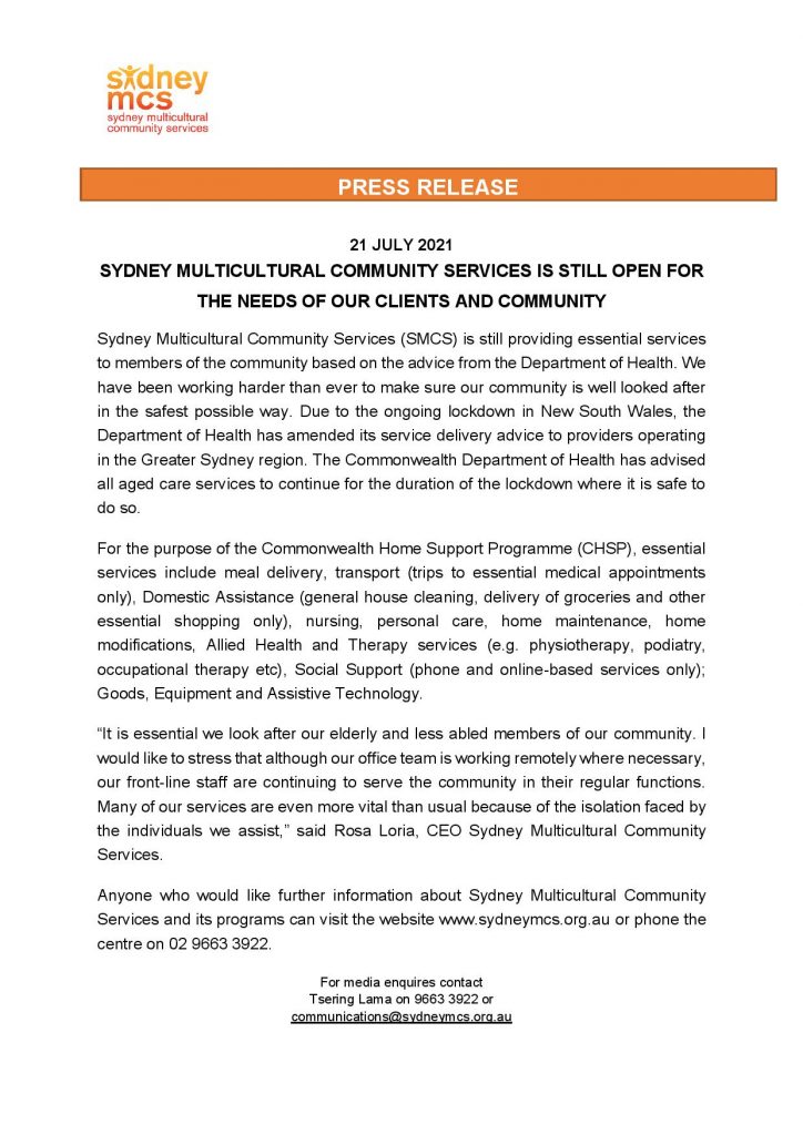 Press Release – SYDNEY MULTICULTURAL COMMUNITY SERVICES IS STILL OPEN FOR THE NEEDS OF OUR CLIENTS AND COMMUNITY / News / By communications@sydneymcs.org.au